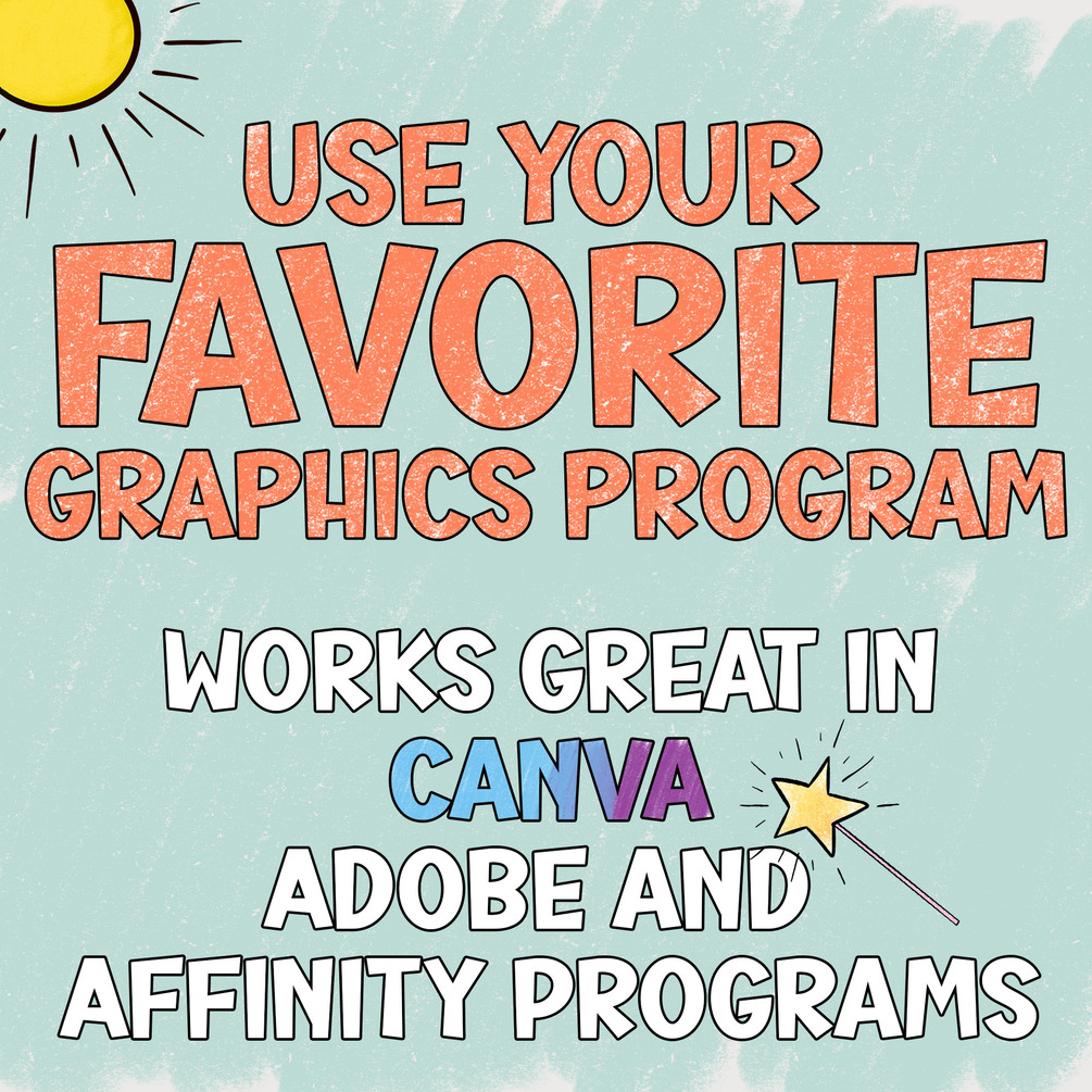 High-Resolution PNG (300dpi) files can be used in almost any graphics program, and the transparent background makes layering the files really easy.